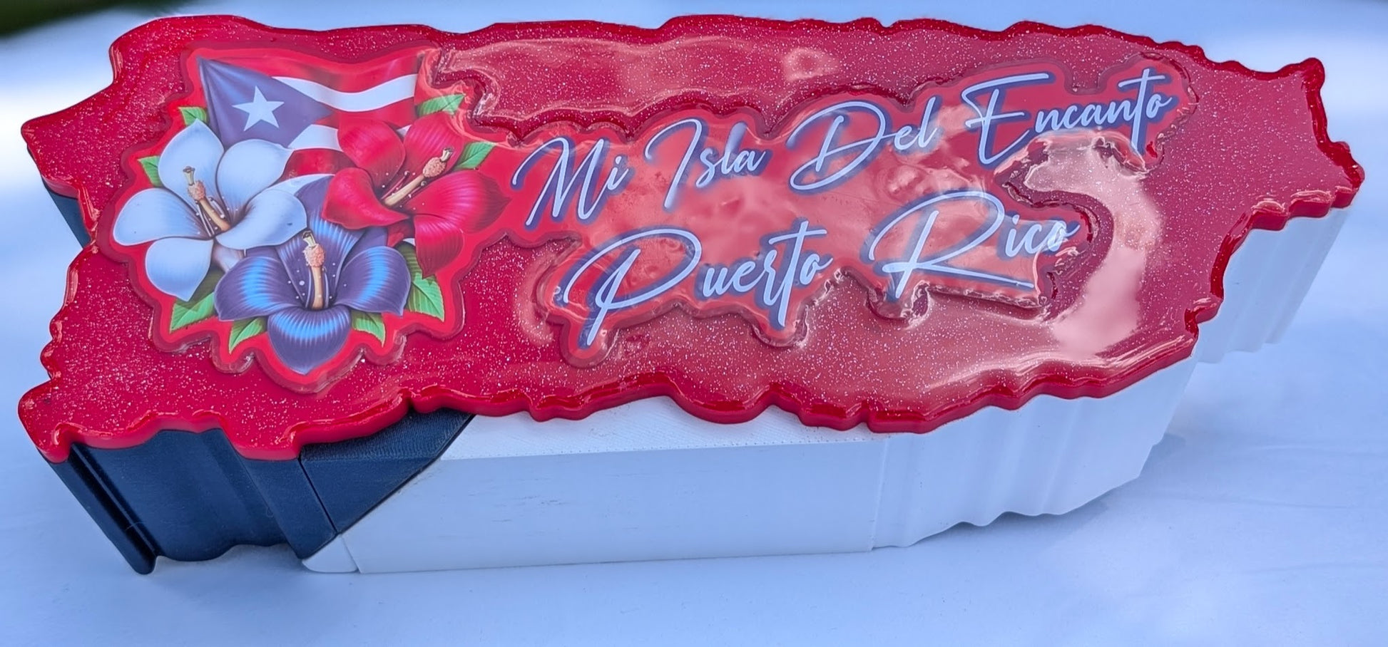 - Caja: Diseño personalizado con forma de la Isla de Puerto Rico, 11 pulgadas de largo